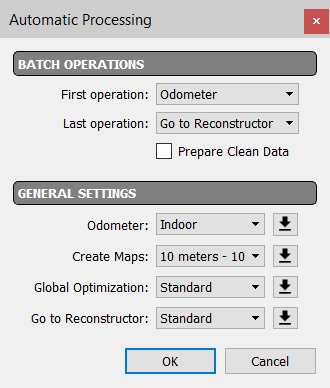 Select the first and the last operation you want to run, choosing between: Odometer: this process calculates the single trajectory registering the clouds on it. Create Maps: this process creates the local maps to be used in the Global Optimizations process. Global Optimization: this process aligns the local maps. Go To Reconstructor: this process exports the results of a Global Optimization process, ready to be imported in a Reconstructor® project. Prepare Clean Data: if flagged, it cleans the maps deleting moving object data (example: walking people, moving cars, etc.) |