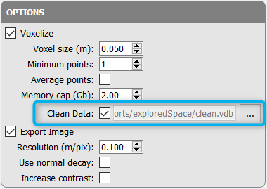 In the Export step Options check Clean Data and select the saved .vdb file to apply the cleaning mask to the exported map. |