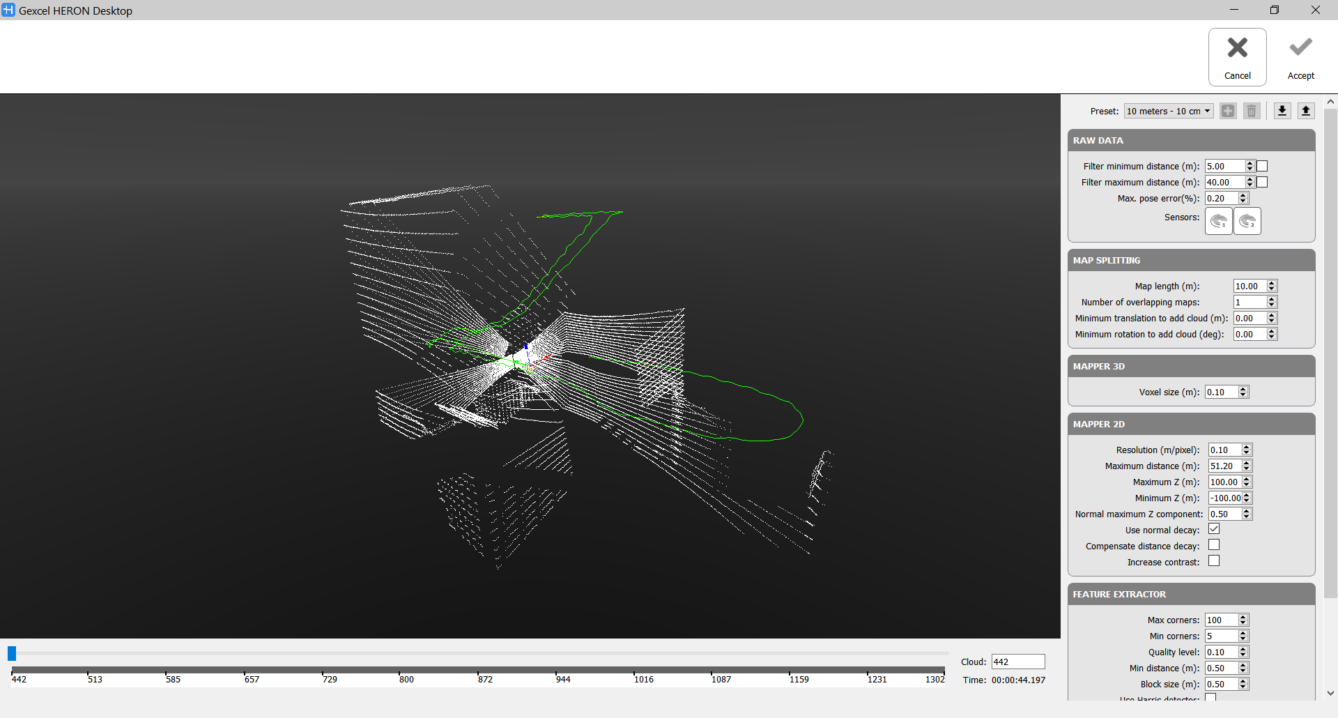 It is possible that the far points are not accurate and, consequently, the created maps will not be correct. In this case, it is possible to select “Filter maximum distance (m)” and set the most appropriate distance. If the set distance is small (like 10/15 m), reduce “map length” to have a good overlap between the maps. |