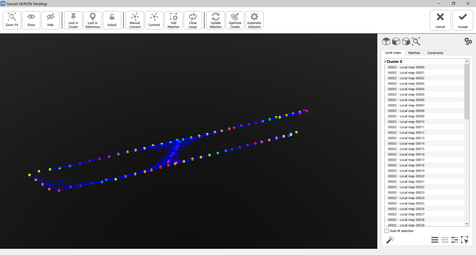 In the 3D window every local map (generated in the Create Maps step) is identified by a colored dot and every connection (Match) between two local maps is a blue segment.