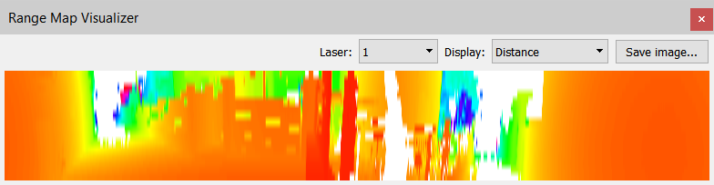 Range Map Visualizer, which provides a 2D visualization of single clouds, by displaying them in terms of range of distance and reflectance. The Heron® MS Twin system is equipped with two laser sensors, so it is necessary to switch from one to another by selecting 1 or 2 in Laser, for Primary and Secondary laser respectively.