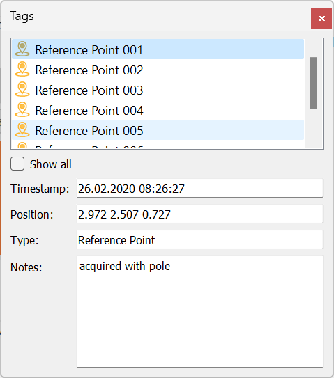 Tags window, which provides a list of Tags saved during the Heron® acquisition and shows them in the 3D window. Timestamp and Position's coordinates are referred to