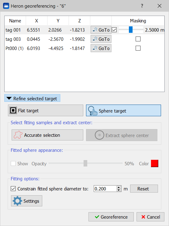 To refine the target position by detecting the sphere's center, select the point cloud area occupied by the sphere (by the Accurate selection) and then extract the sphere center (by the homonym command). The sphere is extracted by fitting of the point cloud and by setting its diameter. The opacity and the color of the item sphere could be managed. |