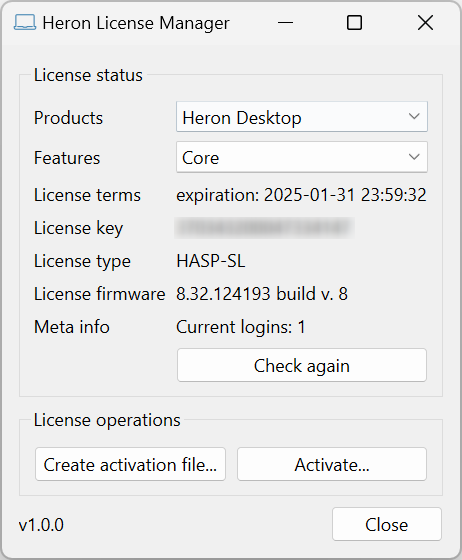 - Activate the license by clicking the Activate... button and loading the activation file (.v2c) that Gexcel or your HERON system provider supplied.