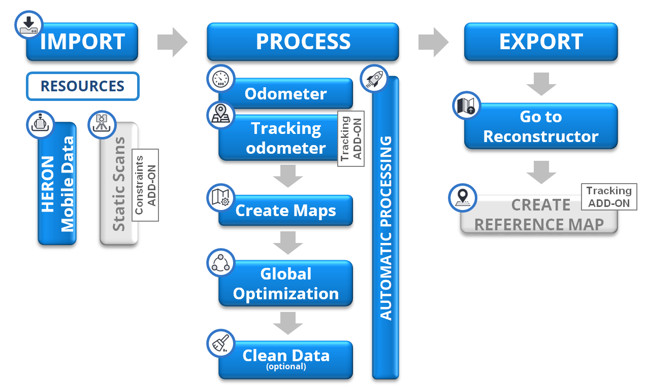 - import the raw Heron® acquisitions (and external point clouds, if the Constraints add-on is available)