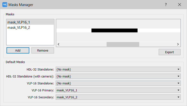 Masks This feature allows to interactively load and apply a mask for the HERON® sensors when obstacles (moving jointly with in the sensors) are partially occluding their view. The obstacle can create null measurements in the occluded areas (not important) but also some distortion due to echoes on the edges if close to the sensor. |