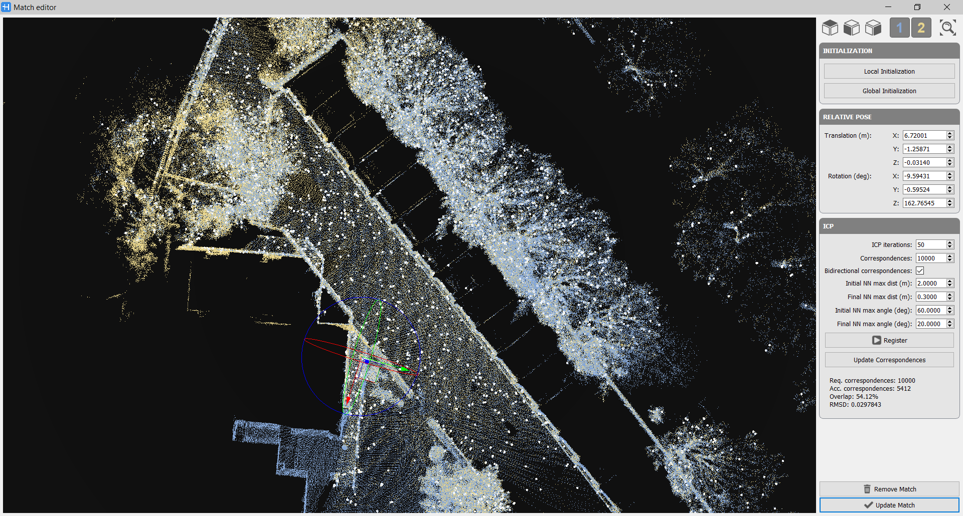 The Match Editor window is to pre-align two selected local maps and refine the alignment by an ICP process.
