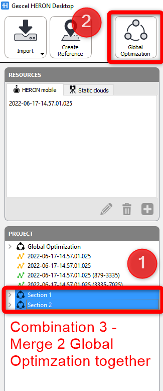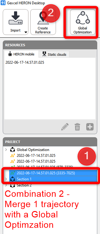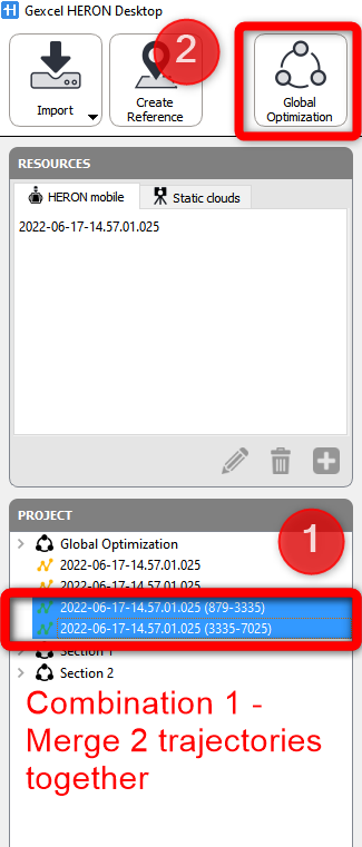Two or more trajectories can be merged (aligned together) using the Global Optimization tool. To access to it, the Create Maps process is required for each trajectory. Once a trajectory has passed through the Create Map step is marked in green