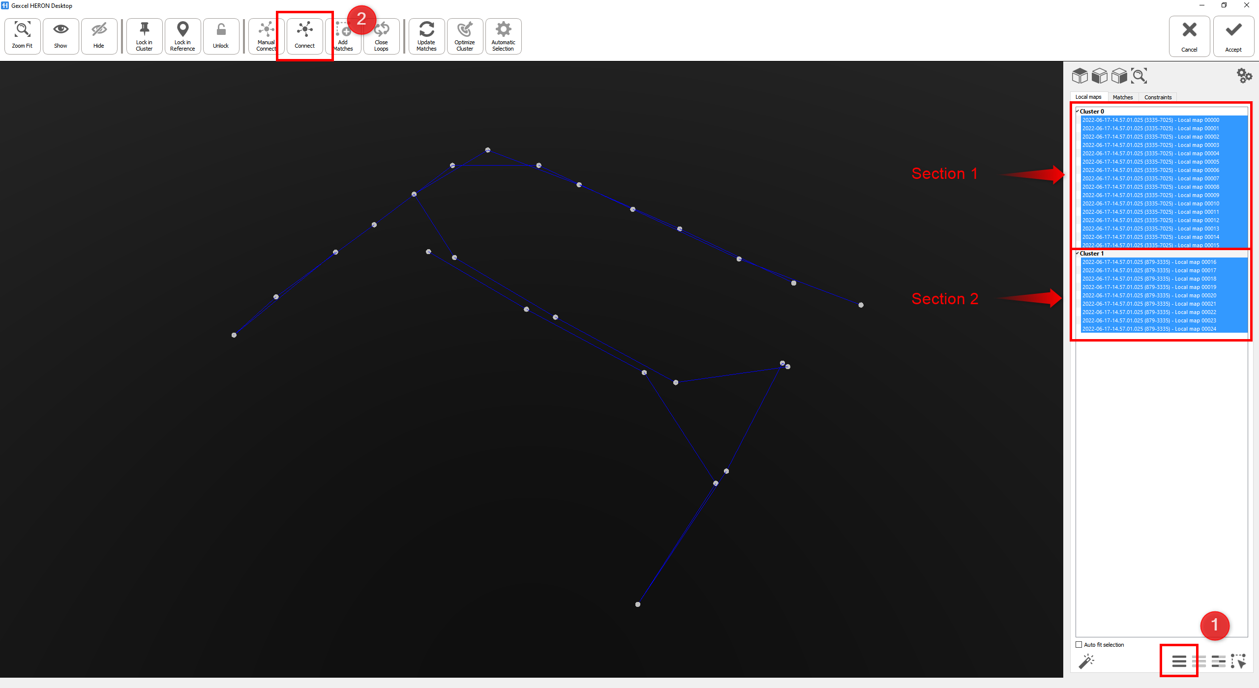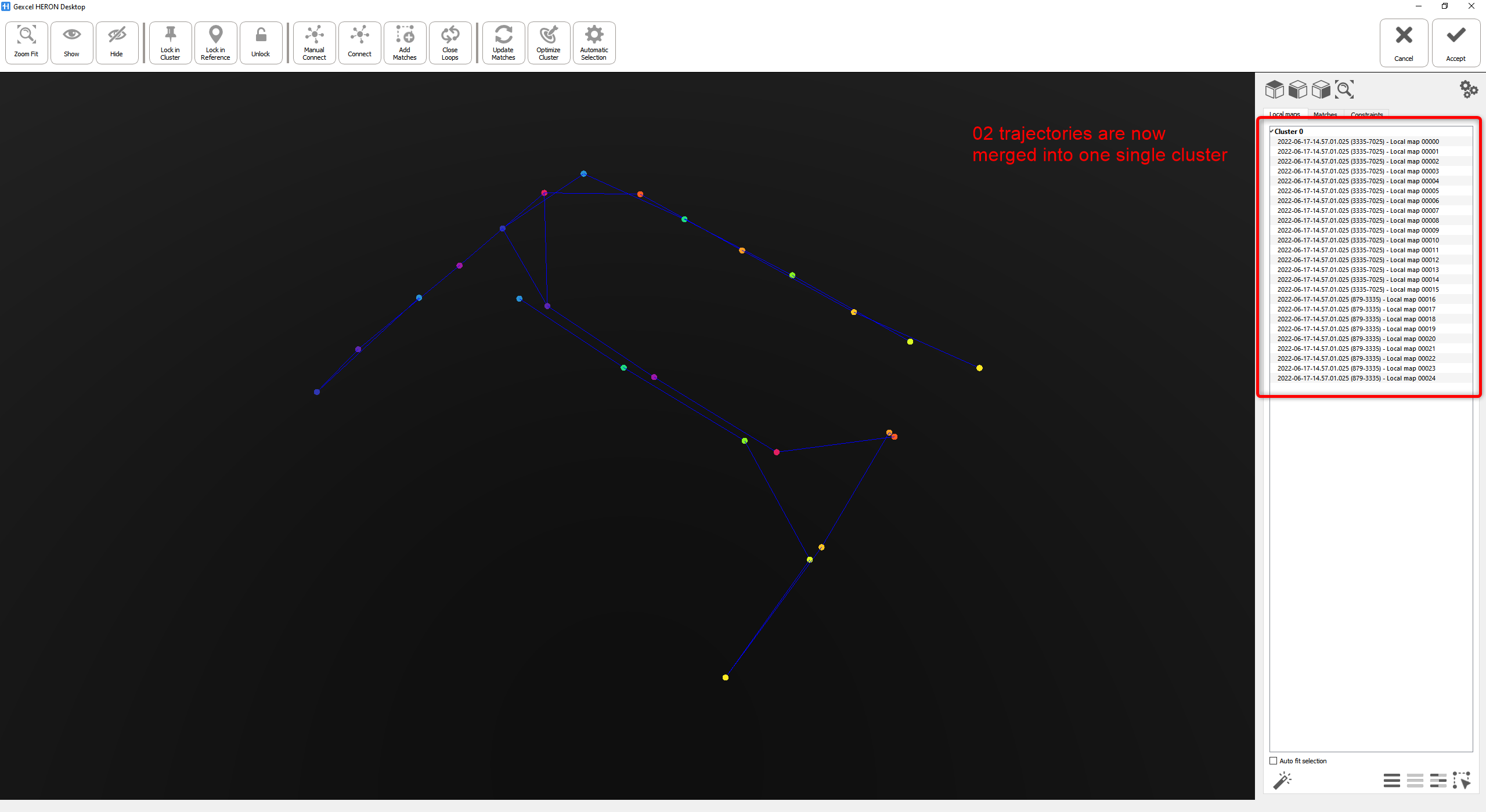 In the Local maps list on the right, the 2 (or more) clusters of maps related to each trajectory are now combined into only one single cluster; it means the merge is successful.