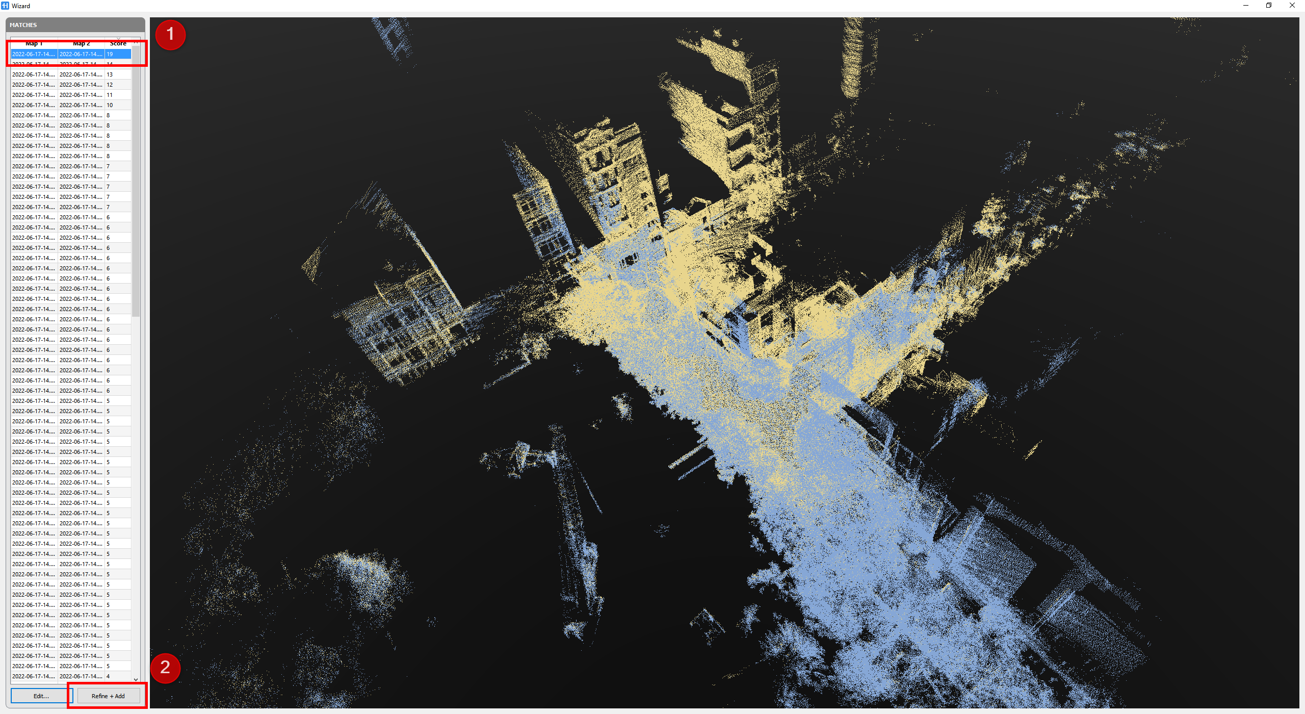 A new Wizard window displays a list of matches (connection from maps) for possible pairs of local maps related to the 2 (or more) trajectories with score for each match. Select the pair which has highest score and see if they are properly overlapped (pre aligned) each other. If the preregistration is fine click on Refine + Add button at the bottom left to refine the pre-registration and add a new connection between two or more cluser of maps.