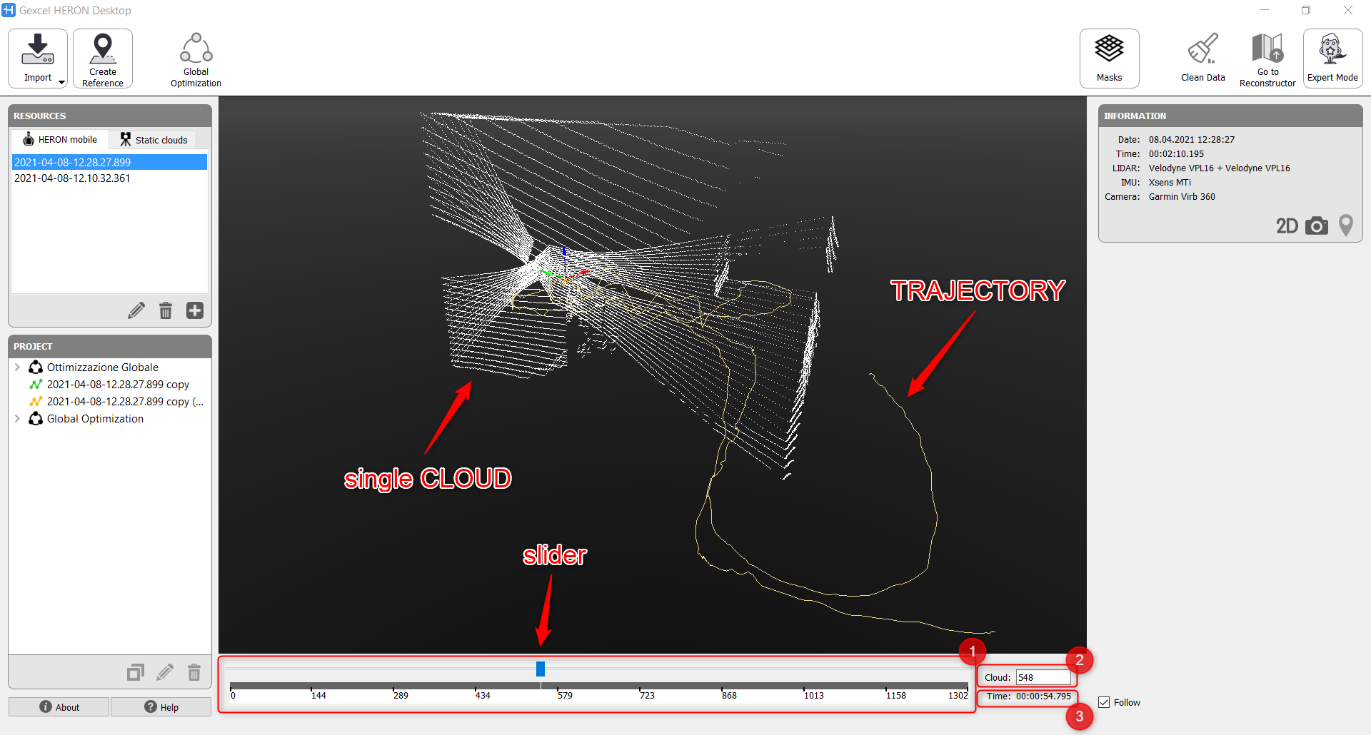 In the lower part of the window, a time bar shows the series of the clouds ➊, where each one is defined at a given step by a sequential number ➋ and by the time [hh:mm:ss] of acquisition ➌. Cloud: 0 and Time 00:00:00.00 define the starting point of the survey.