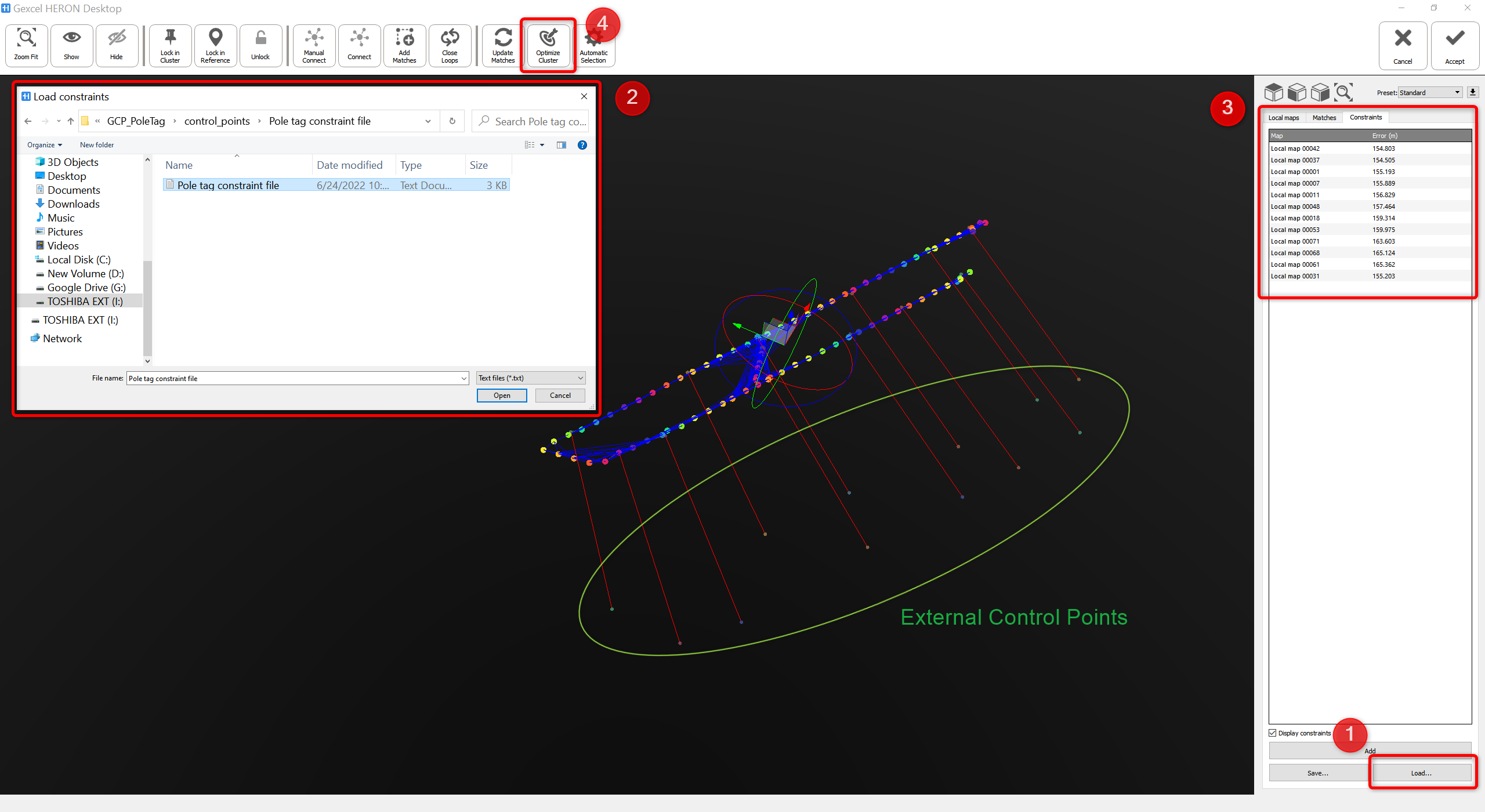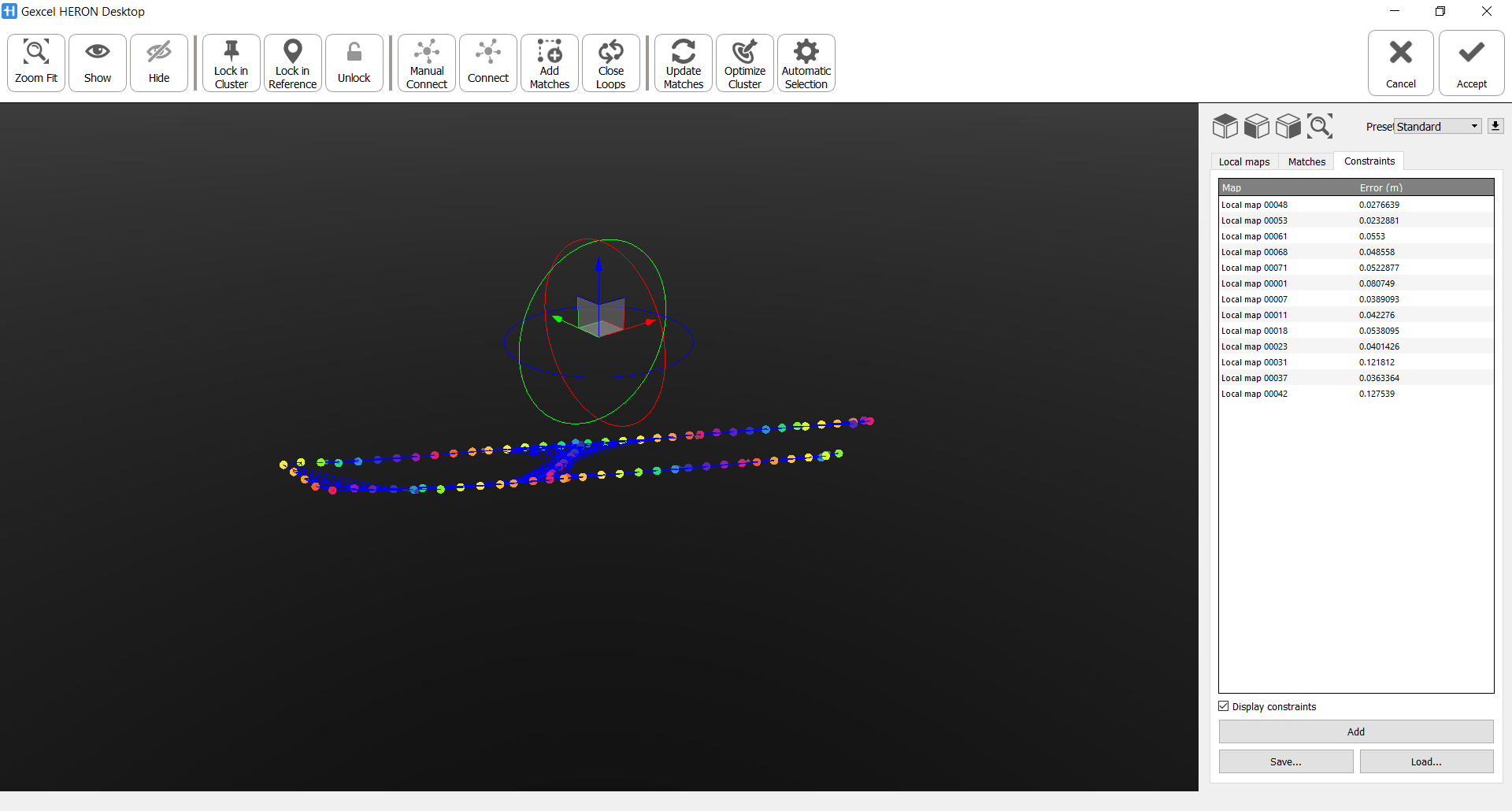 And on the right, in the Constraint tab, we can see the relative error between GCPs and Reference points in their Local maps. At this step, as shown in the below image, go to Local Maps tab, select the Cluster and click on Optimize cluster to optimize the HERON® project with respect to GCPs.