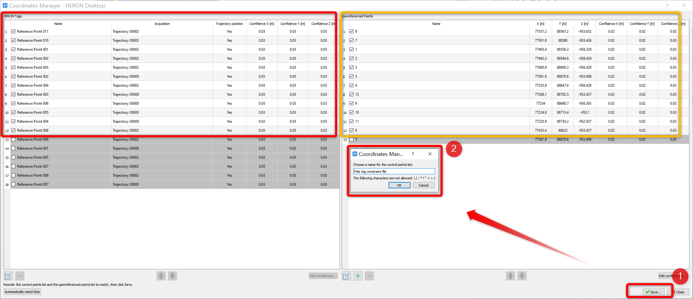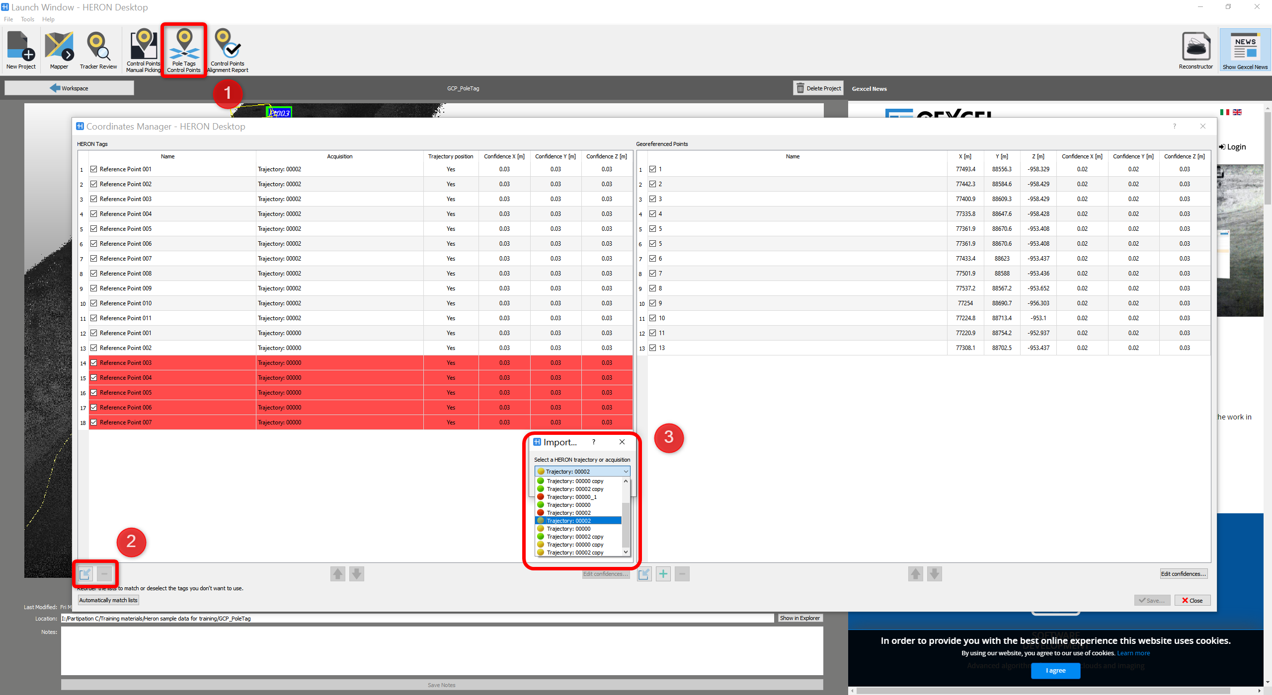and the reference points (points acquired by Pole tags function during the survey) are listed in the HERON tags side. If more trajectories are available, repeat this operation. All the Pole tags related to a specific trajectory are listed and the reference trajectory is specified.