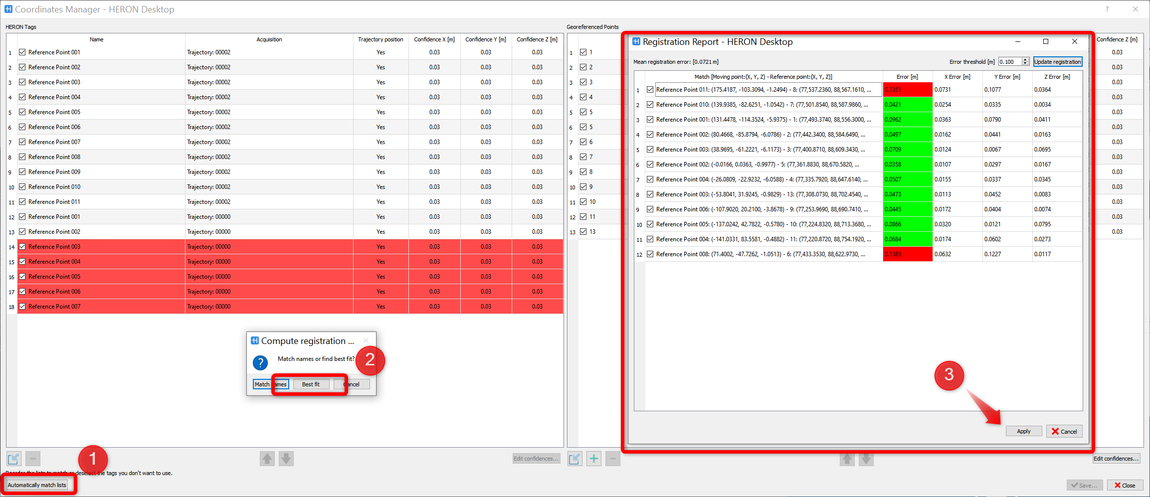 After having all the Pole tags points (in HERON local coordinates system) and the external control points (in global coordinate system) listed in the Coordinates Manager window, click on Automatically match lists button. Choose the Best fit to automatically match the two list. A registration report will pop-up showing the initially estimated relative errors between 2 point lists; the next Global optimization process aims to minimize this initial matching error.