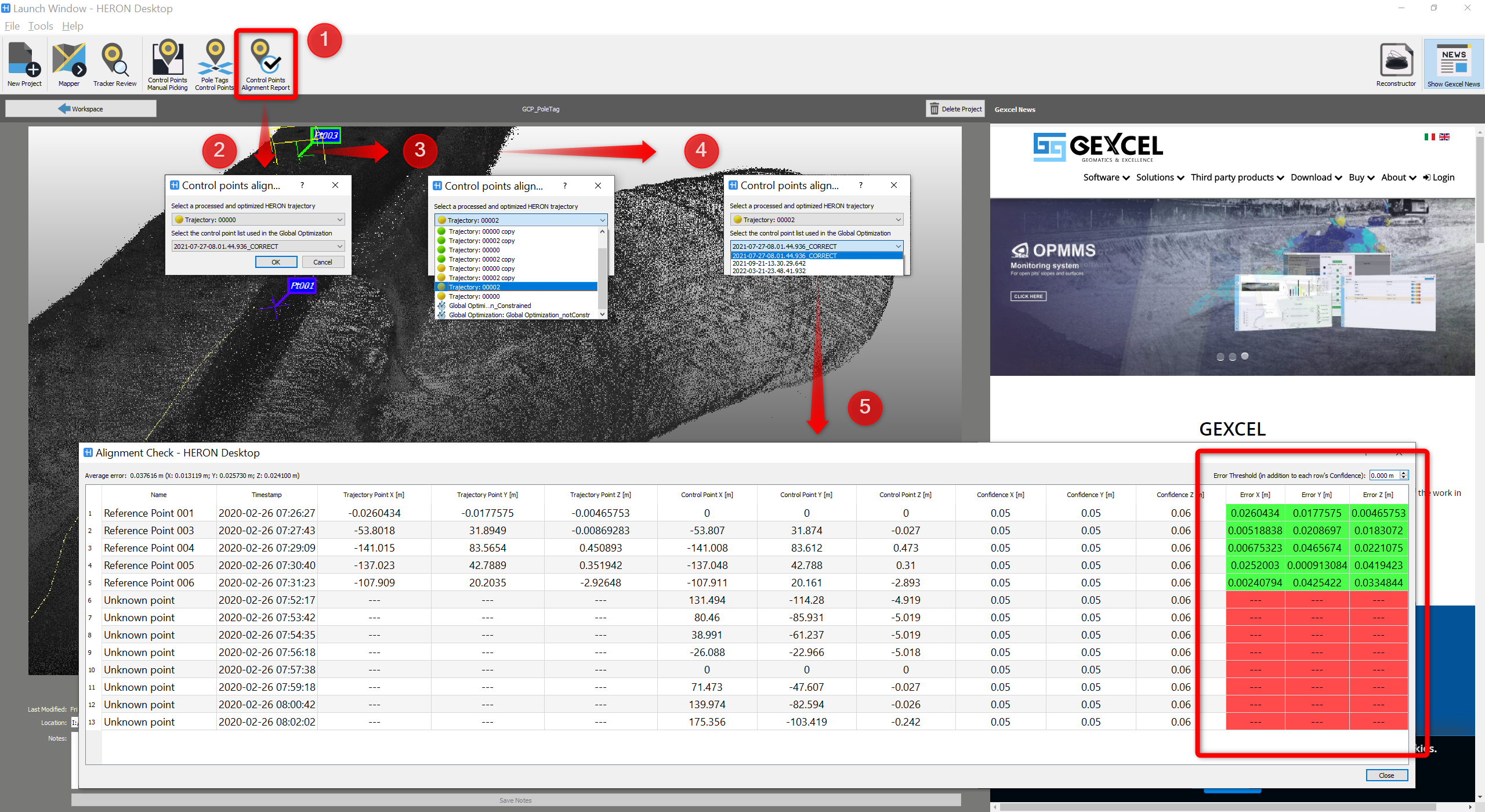 To have the report of the Global Optimization effect in correspondence of the control points with respect to each components of X Y Z, close the Mapper workspace and get back to Launch Window of HERON Desktop then follows the steps from ➊ to ➎ in the image below: