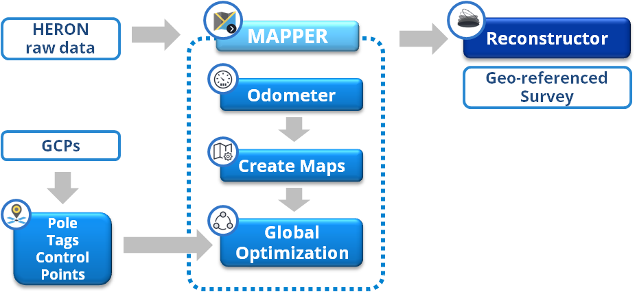 Back in the office: Processed the acquired HERON® data along the odometer, create maps, and global optimization steps, save the Global Optimization by pressing accept