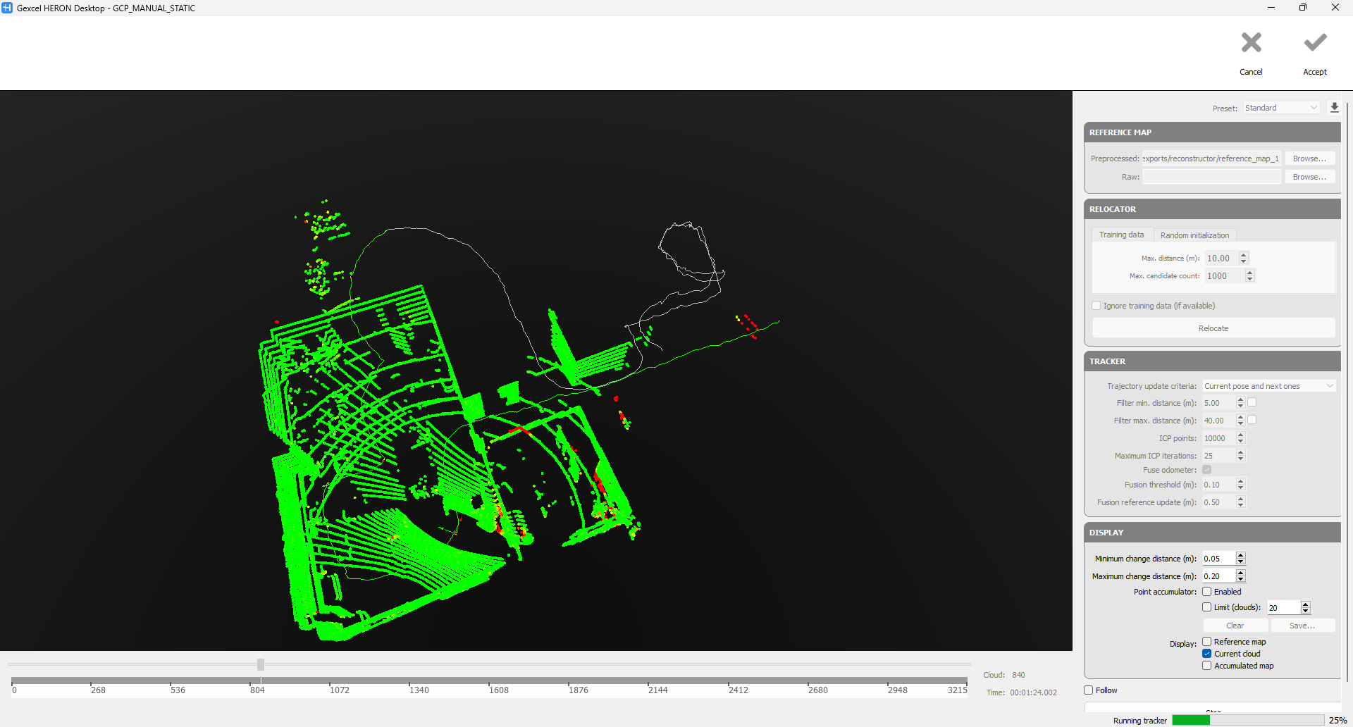 After the five steps explained in the Tracking and Change Detection Workflow, let to complete the Run tracker process until all the single clouds of the trajectory are aligned with the reference map and a green trajectory is generated.