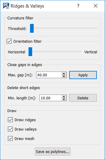 This is a semi-automatic technique to detect Ridges (prominent mesh edges) and Valleys (reentrant mesh edges). When you open this dialog, the ridges and valleys are calculated and drawn in the mesh editor. Ridges are drawn as blue polylines, valleys are in red. Ridges and valleys can be then saved as polylines. The idea is that tool shows you an initial extraction of ridges and valleys, successively you refine the parameters of extraction and see the effects of your changes in real time. You can refine the parameters until you are not satisfied, and then save the ridges and valleys as polylines in the project. The parameters of ridges&valleys extraction you can modify regard the curvature, the horizontality, the length of the edges and the gaps between them. While you modify the parameters and recompute the ridges&valleys, you can choose to turn on or off the visualization of the ridges, the valleys and the mesh, via the three check-boxes in the Draw groupbox at the bottom of the dialog. Curvature filter The topmost slider of the dialog allows you to modify a threshold on the curvature of the ridges and valleys. Ridges and valleys are edges shared by your mesh's triangles. Each edge has a curvature associated, depending on the angle between the two associated triangles. A threshold on the curvature filters out the smoother edges and leaves only the steeper ones, which normally are the most important. Scroll the slider to see the effect of the threshold in real time. Orientation filter Below the curvature filter, you can also activate a orientation filter. This filter keeps only the edges whose angle with respect to the horizontal plane is close to the angle you indicate with the slider. In this way, you can choose to keep only the horizontal edges, or the vertical ones, or the ones with a given inclination. Close gaps in edges Sometimes ridges and valleys come in many segments with small gaps among them. In the groupbox Close gaps in edges you find a tool to close those gaps and get the ridges and valleys as continuous polylines. You can set the maximum gap distance to close, and press Apply. Reconstructor will start closing the gaps from the smallest to the biggest, without creating loops or bifurcations. Delete short edges In the Delete short edges a tool comes to filter out polylines whose total length is less that the specified parameter. Normally you want to discard short edges because they are not the main ones. The main ones should instead be found by closing the gaps among them. General procedure As general procedure, we advice to use the described filters in the order given above, and to close and open the dialog if the result is not satisfactory. Once the extracted ridges and valleys are good enough to describe the important edges of your model, press Save as polylines at the bottom of the dialog. New polylines with the ridges and valleys will be added to your project. |