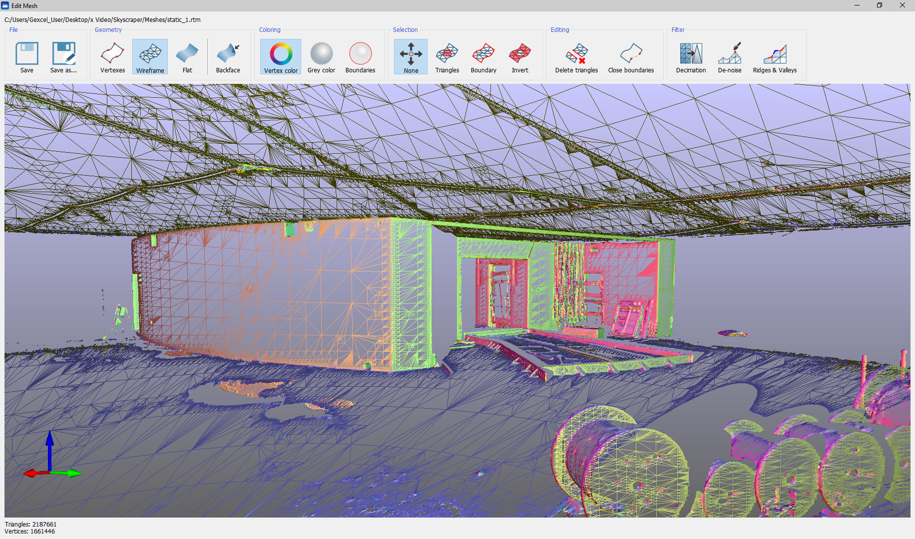 When the button None is checked, you can navigate the mesh. By clicking Triangles, you start selecting the mesh triangles by drawing a rectangle on the viewport. Selected triangles are highlighted in yellow. The button Invert enables you to invert the current triangles selection. When you are drawing the selection rectangle, keeping pressed Shift will enable you to add triangles to the current selection by drawing another selection rectangle. The button Boundary turns on another selection mode. In this mode you can select one of the circular boundaries that the mesh has. Boundaries are polygons formed by those mesh edges who belong to one and only one triangle. A closed mesh has no boundaries. Boundaries selected in this mode may delimit a hole that you want to close. After selecting the hole's boundaries, you can click on Close boundaries in the Editing button group.