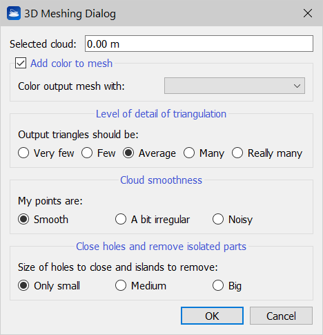 In the third parameter box, you can take into account the cloud smoothness. If your cloud represents clean construction data, then select Smooth. If, however, your cloud contains noisy territorial data, then select Noisy.