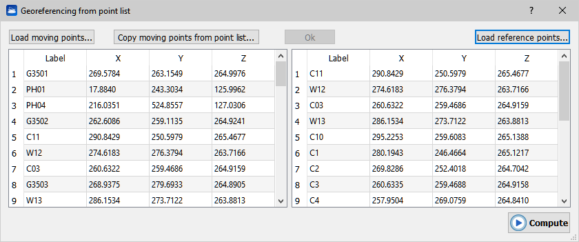 Note: to start the registration, it is not necessary for the left table to contain as many points as the right table.