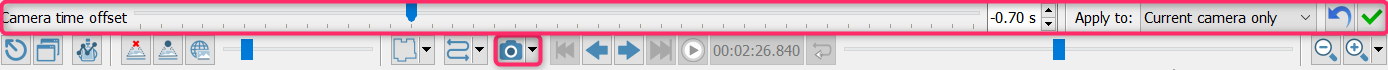 Follow camera trajectory direction To jump to a specific timestamp. By clicking on it a window will appear, showing the time information about the trajectory and the absolute/relative (respect to the beginning of the Survey) timestamps to set. |