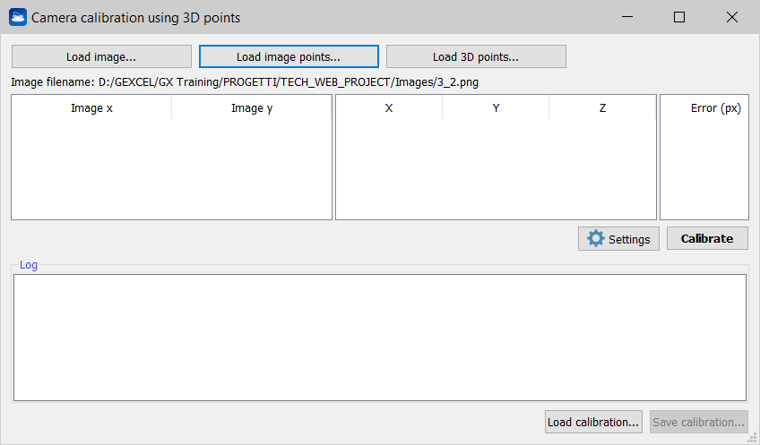 As first step, the image to be calibrated must be selected by using the Load Image button. Subsequently image points and 3D points must be loaded using the Load Image Points and Load 3D Points buttons respectively.