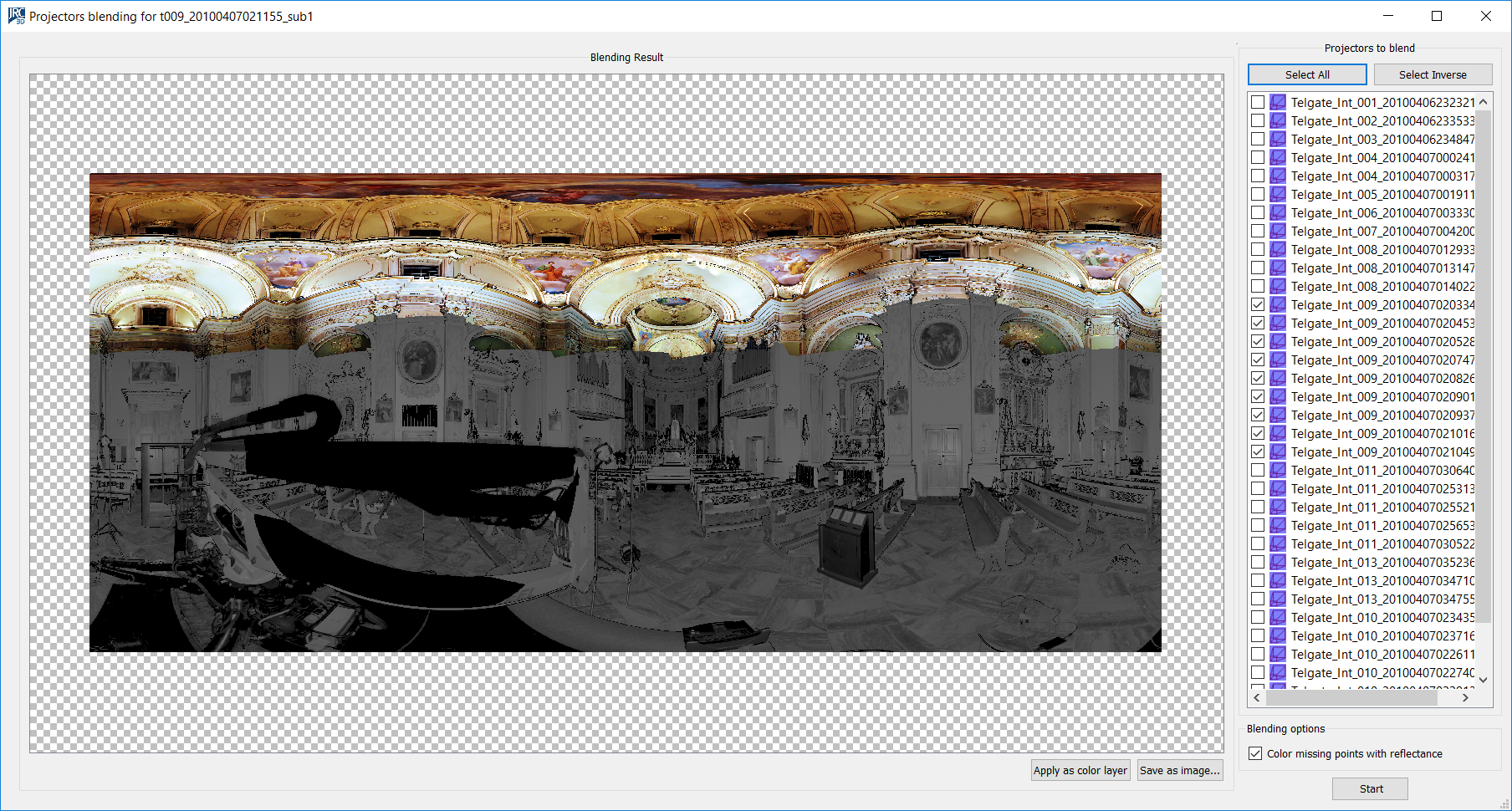 You can load all the projectors available in the current project. The color layer is computed by projecting on the point cloud and blending all the images coming from the projectors. Different blending algorithms are applied depending on the selected options.