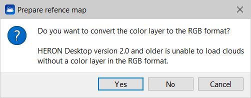 If you are using Heron® Desktop version 2.0 and older, you need to care of the colorization of the exported point cloud, a warning will remind it: