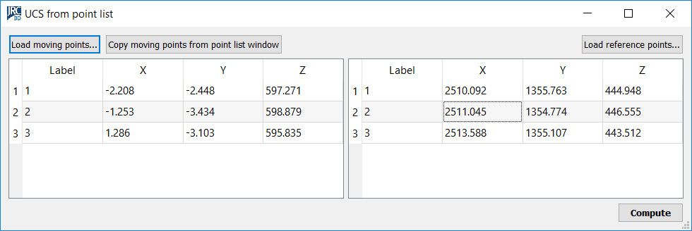 Press the buttons Load moving points on top left to load a text file with the first point list, and Load reference points on top right to load a text file with the “reference” coordinates of the points, the coordinates that are going to be shown in the new UCS. To parse the text files with the point list, an appropriate tool is used. You can use as moving points the points listed in the point list window, via the appropriate button on top left.