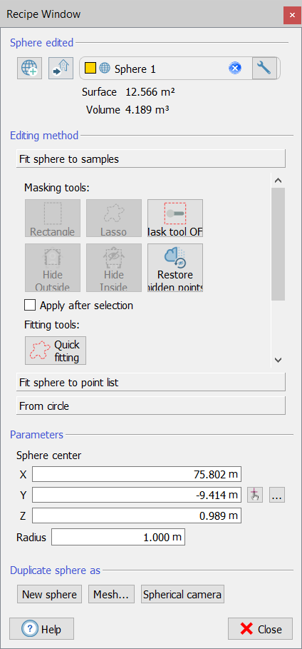 This is a toolbox for creating/editing a sphere from samples, points or circles. Start by dragging and dropping in the editor window the sphere you want to edit. If no sphere is dropped, a new sphere will be created when when you activate any of the functions or when you click on In the upper part of the window the Surface and the circumscribed Volume are listed. |