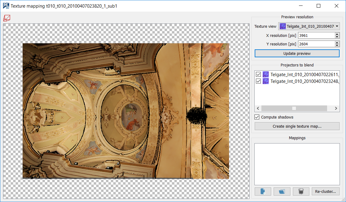 Create single texture map: create the texture by blending the checked projectors. An image of png format is created, plus a 2f file that stores the computed texture coordinates for the mesh vertexes, which is listed in the Mappings. Check if shadows must be computed.