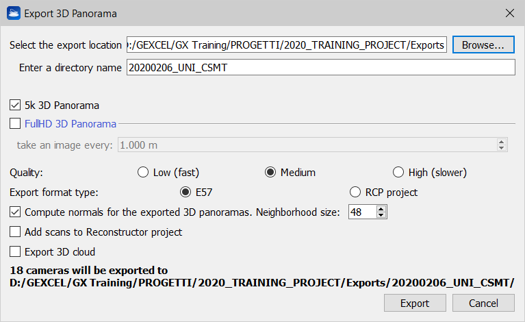 - Flag the option Export 3D cloud if you want to export also the original 3D point cloud beside single 3D Panoramas.