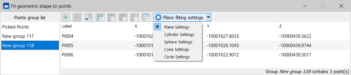 According to the number of the selected points a plane, a cylinder, a sphere, a cone or a circle can be fitted.