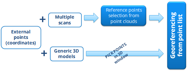 You can georeference one or more scans by selecting at least 3 points from different scans, known also in another reference system (for example from topography). In the same way a georeferentiation of generic 3D models (i.e mesh models from BIM) is possible (see 3D Model georeferencing).