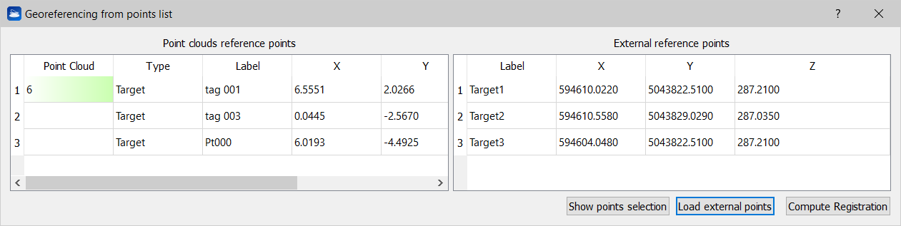 Select the targets to be used to georeference the point cloud, Load (1) an external file (.txt) containing the surveyed targets coordinates and compute (2) the roto-translation process to georeference the point cloud.