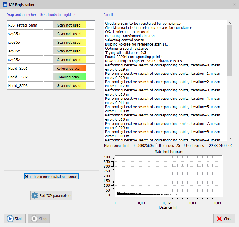 When the parameters are set, press the button Process on bottom left. ICP begins, showing log messages in the right-central Result panel of the dialog. Also, the graph on bottom right displays the error histogram for each iteration. This is useful to see at a glance whether the algorithm is converging.