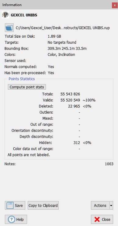 Windows Information window The information dialog includes general properties, points statistics, color and geometrical properties of the Reconstructor's items.