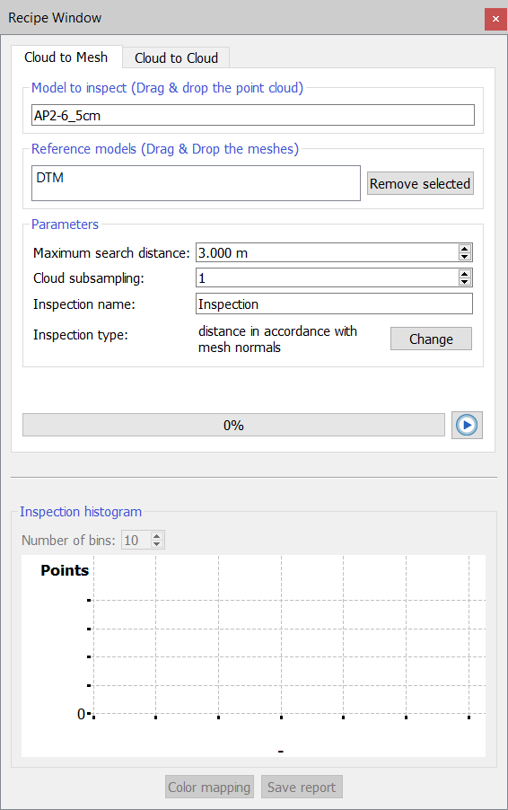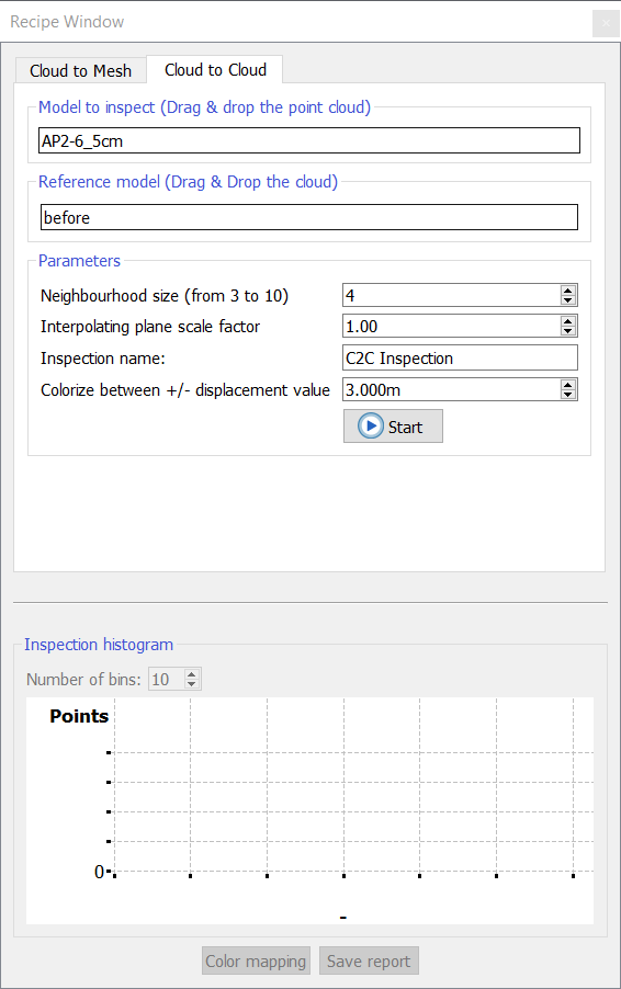 As inputs, user must provide a model to inspect and one reference model. Both models must be a point cloud (structured or unstructured).