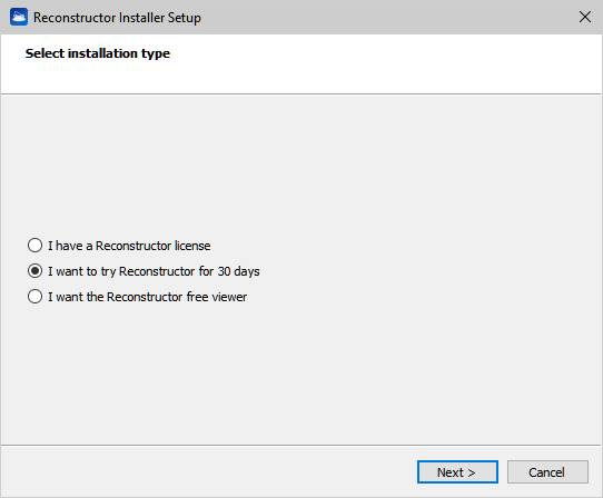 1. Install the same version of Reconstructor® on all computers to be used by selecting the type of installation "I want to try Reconstructor for 30 days". After installing the software reboot the PC before to continue.