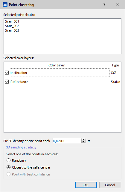 The selected clouds appear in the top list of the dialog. Below, the common color layers across the clouds are found. The cloud that results from the clustering will contain only the color layers that are present in all input clouds and that are chosen. Point normals will be transformed so that they will be correct in the resulting cloud.