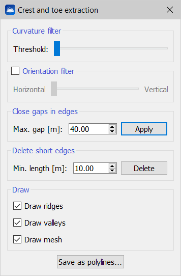 This is a semi-automatic technique to detect Ridges (prominent mesh edges) and Valleys (reentrant mesh edges). When you open this dialog, the ridges and valleys are calculated and drawn in the mesh editor. Ridges are drawn as blue polylines, valleys are in red. Ridges and valleys can be then saved as polylines. The idea is that tool shows you an initial extraction of ridges and valleys, successively you refine the parameters of extraction and see the effects of your changes in real time. You can refine the parameters until you are not satisfied, and then save the ridges and valleys as polylines in the project. The parameters of ridges&valleys extraction you can modify regard the curvature, the horizontality, the length of the edges and the gaps between them. While you modify the parameters and recompute the ridges&valleys, you can choose to turn on or off the visualization of the ridges, the valleys and the mesh, via the three check-boxes in the Draw groupbox at the bottom of the dialog. Curvature filter The topmost slider of the dialog allows you to modify a threshold on the curvature of the ridges and valleys. Ridges and valleys are edges shared by your mesh's triangles. Each edge has a curvature associated, depending on the angle between the two associated triangles. A threshold on the curvature filters out the smoother edges and leaves only the steeper ones, which normally are the most important. Scroll the slider to see the effect of the threshold in real time. Orientation filter Below the curvature filter, you can also activate a orientation filter. This filter keeps only the edges whose angle with respect to the horizontal plane is close to the angle you indicate with the slider. In this way, you can choose to keep only the horizontal edges, or the vertical ones, or the ones with a given inclination. Close gaps in edges Sometimes ridges and valleys come in many segments with small gaps among them. In the groupbox Close gaps in edges you find a tool to close those gaps and get the ridges and valleys as continuous polylines. You can set the maximum gap distance to close, and press Apply. Reconstructor will start closing the gaps from the smallest to the biggest, without creating loops or bifurcations. Delete short edges In the Delete short edges a tool comes to filter out polylines whose total length is less that the specified parameter. Normally you want to discard short edges because they are not the main ones. The main ones should instead be found by closing the gaps among them. General procedure As general procedure, we advice to use the described filters in the order given above, and to close and open the dialog if the result is not satisfactory. Once the extracted ridges and valleys are good enough to describe the important edges of your model, press Save as polylines at the bottom of the dialog. New polylines with the ridges and valleys will be added to your project. |