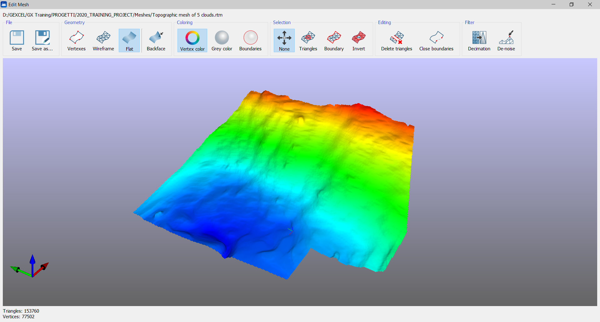 Once you have selected some triangles with the button Triangles explained in the former paragraph, you can delete the selected triangles with Delete triangles. The button Close boundaries allows you to close a mesh hole whose boundaries have been selected. This function works best with small and with close-to-planar holes.