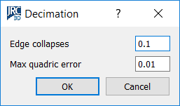 This tool allows you to simplify your mesh substituting small triangles with bigger ones if the mean-square error introduced in this way is smaller than a user-customizable threshold.. Simplification is based on conveniently collapsing edges among triangles. For each edge shared by two triangles, Reconstructor® assesses whether collapsing it or not. Collapsing an edge means assigning the edge's two vertices to coincide in the edge's middle point, and adjusting all neighboring triangles consequently. If the quadratic error between the surface before and the surface after the collapsing is below the parameter Max quadric error of the dialog, then the edge is collapsed. The algorithm tries to collapse a percentage of edges as specified by the parameter Edge collapses, where 0.1 stands for 10%. |