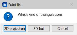 Reconstructor® asks you whether you want to mesh the points projecting them onto the current view and using a Delaunay 2D meshing algorithm, or whether you want to create a “3D hull”: a convex 3D polygon containing all the points.