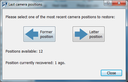 Reconstructor® keeps in memory the last 1000 camera positions through which you navigated. Through this dialog, you can browse them and go back to your previous steps, restoring useful views on your models when you lost them.