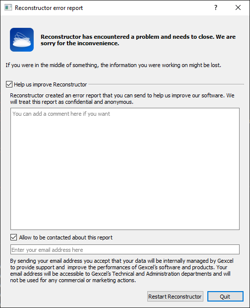 In the event of a crash, the Reconstructor® application closes and a dialog is shown that invites to send a crash report and  (optionally) allows you to send a feedback message to attach to the report.