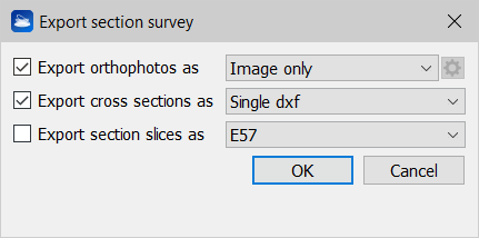 Export orthophotos as Image only: to export only an image file, not scaled and not georeferenced Image + AutoCAD script: to export an image file within a script file to import scaled and georeferenced images in AutoCAD (see also Exporting orthophotos to AutoCAD) Export cross sections as Single dxf: to export cross sections as polylines where any group of polylines will be included in a single .dxf file Multiple dxf: to export all the cross sections as polylines in a single .dxf file Multiple Shape files: to export all the cross sections in a single .shp file Export section slices as E57/LAS: to export the slices as point clouds in E57 or LAS format. |