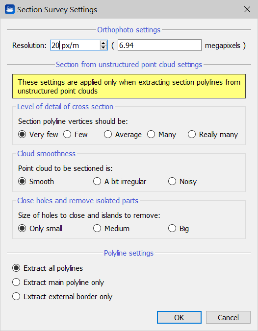 Orthophoto settings The resolution is automatically computed according to orthophoto's dimensions, but it is possible to manually change it. The resulting dimension ( in megapixels) will be computed and displayed. Section from unstructured point cloud settings When sectioning unstructured point clouds further settings can be used to extract more detailed cross sections polylines. Level of detail of cross section: you can specify how many vertices you want to use for your output polyline. The more the vertices, the finer the details that will be reconstructed. Cloud smoothness: if your cloud represents clean construction data, then select Smooth. If, however, your cloud contains noisy data, then select Noisy. Close holes and remove isolated parts: you can here specify the size of the holes that are going to be closed in the polyline, and the size of the “islands”, small disconnected components that may have been created. The size is computed as ratio between the length of the hole/island and the length of the whole polyline. Polyline settings The cross sections polylines are computed interpolating the slice of point cloud at the turn of the cutting planes. By selecting one of the following options you can define the degree of extraction of cross sections polylines to be included into the final section survey. These settings must be mainly managed in tunnels sectioning. Extract all polylines: to keep all the edges obtained from the intersection between cutting plane and model's slices. Extract main polylines only: to delete short edges from polyline. Extract external border only: to close holes in main borders, keeping only most external borders. Be careful when more tunnels or hollows are intersecting in the same section. |