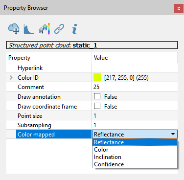 To look at point clouds’ color layers, select the point cloud from the project window and set the Color Mapped option in the Property Browser. |